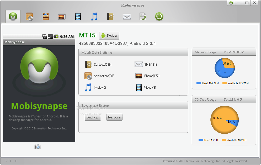 Through the tools the program offers, you can edit your pictures, movies, songs, messages, apps, contacts, and even calls records. Thus, you can use Mobisynapse as a mechanism of backup to store information on your smartphone or tablet.