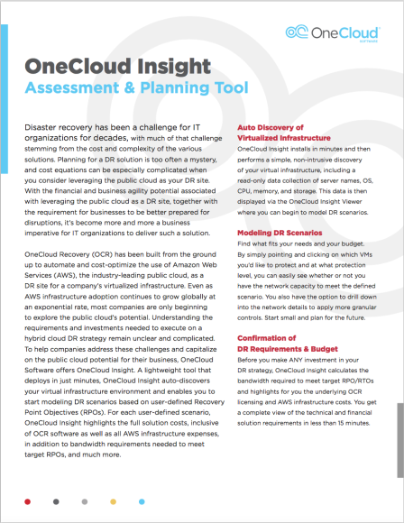 The OneCloud Insight Assessment & Planning Tool, is a lightweight application used to model implementation scenarios for a disaster recovery (DR) site in the AWS cloud based on your current environment.